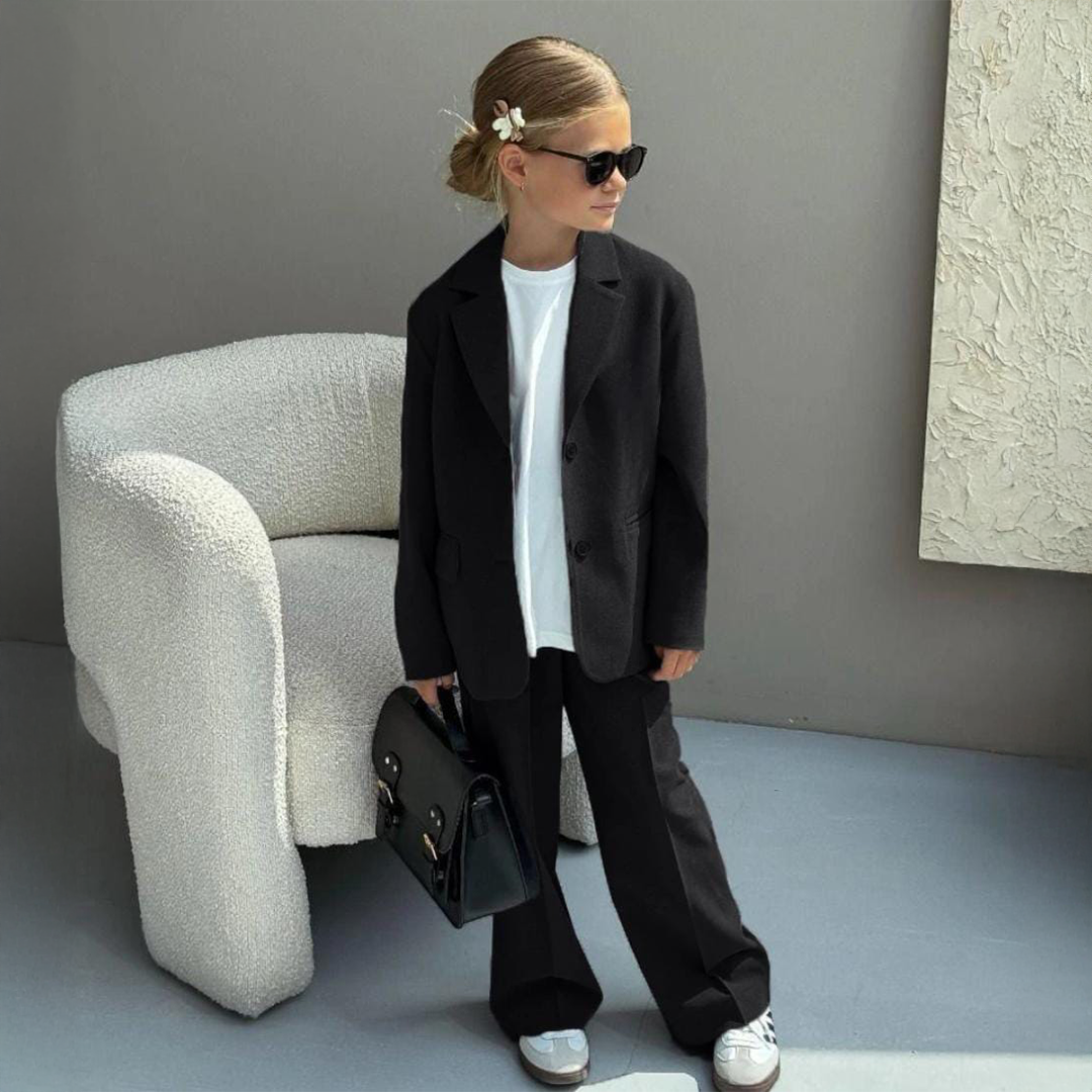 Küçük stil sahibi çocuklar için tasarlanan unisex siyah blazer takım, sade ama güçlü duruşuyla her yaş grubuna uyum sağlar. Hem kız hem erkek çocuklar için ideal olan bu takım; özel günlerde, okul etkinliklerinde, doğum günü çekimlerinde ve günlük şıklıkta tercih edilen modern bir parçadır.